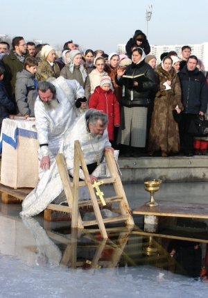 В храмах совершаются особые молитвы о ниспослании воде благодатной силы, после чего священник троекратно погружает в воду крест. Это водоосвящение называется великим по особенной торжественности обряда, проникнутого воспоминанием о крещении Спасителя в Иордане.