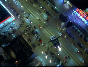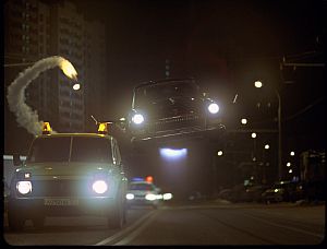 Для съемок самого зрелищного полета - над Тверской - было изобретено еще одно техническое приспособление. На улице установили два огромных крана, между которыми натянули кевларовый трос длиной 300 метров. По этому тросу ездила радиоуправляемая камера, имитировавшая полет.